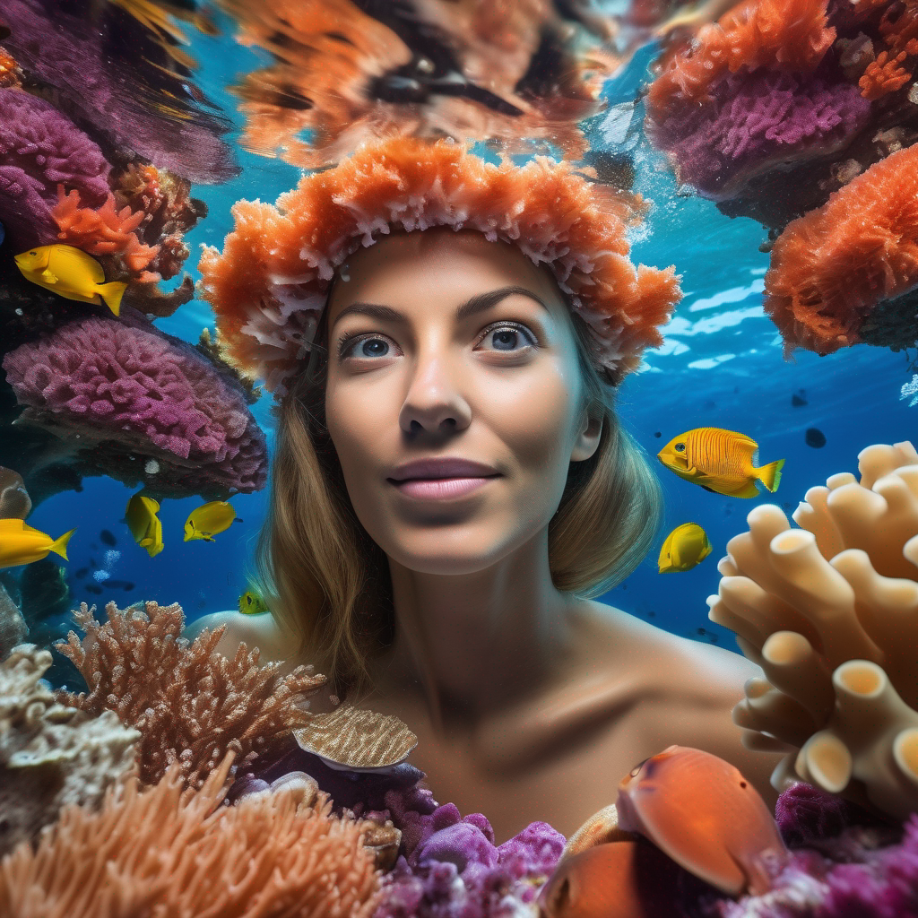 The beautiful picture-perfect chef is captured underwater in a vibrant coral reef. The close-up shot showcases their passion and skill, while the ultra-high quality of the photo portrait highlights every detail with stunning clarity.