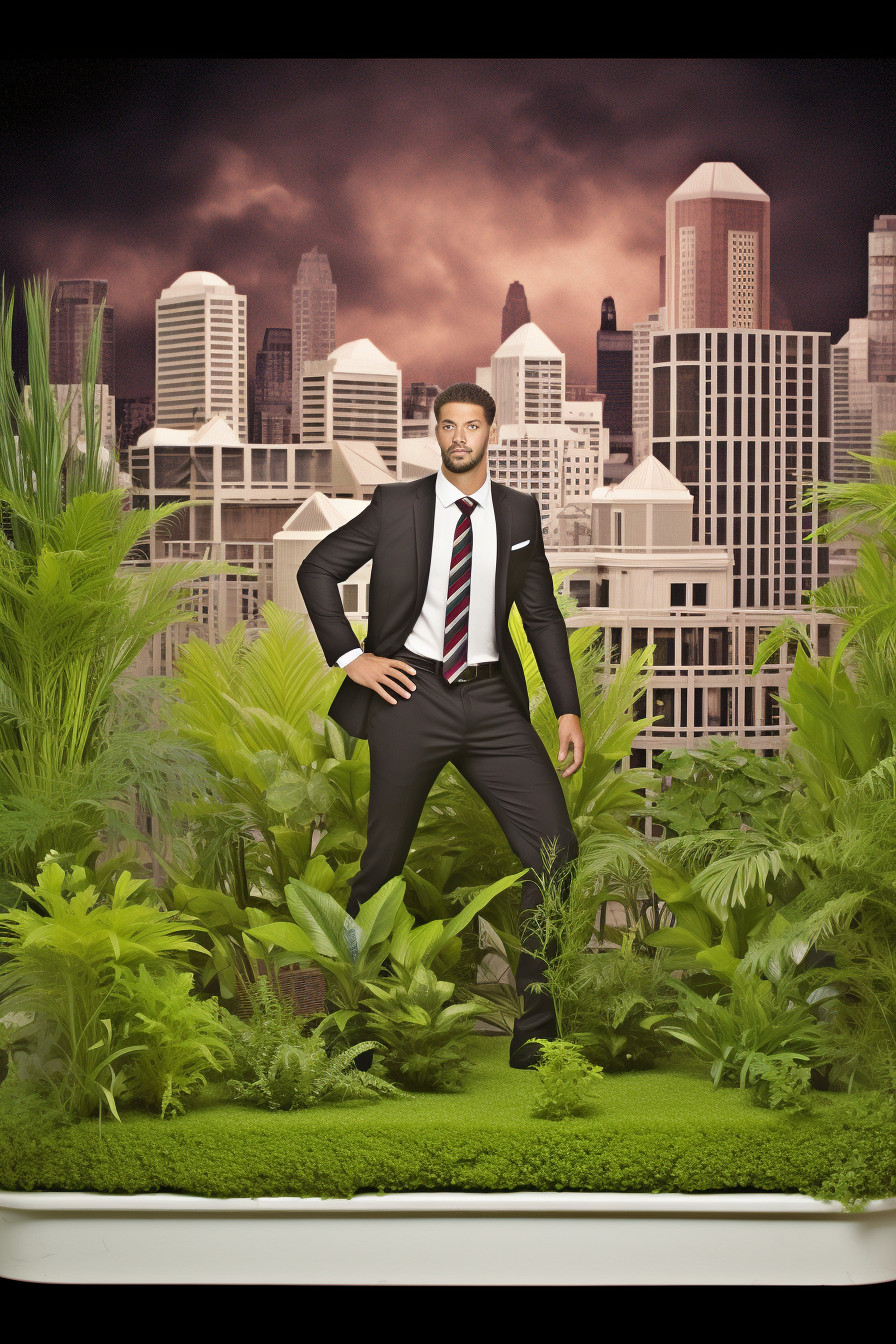 A beautiful and athletic salesperson is captured in an award-winning full-body shot, standing amidst the lush greenery of a rooftop garden.