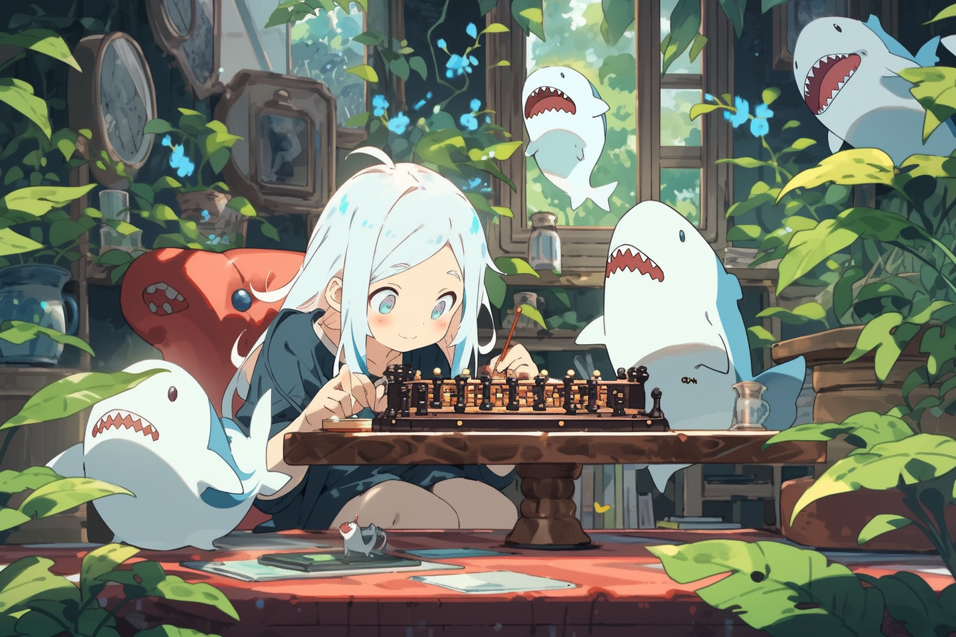 A young girl learning to play chess with a swirl of excitement and curiosity.