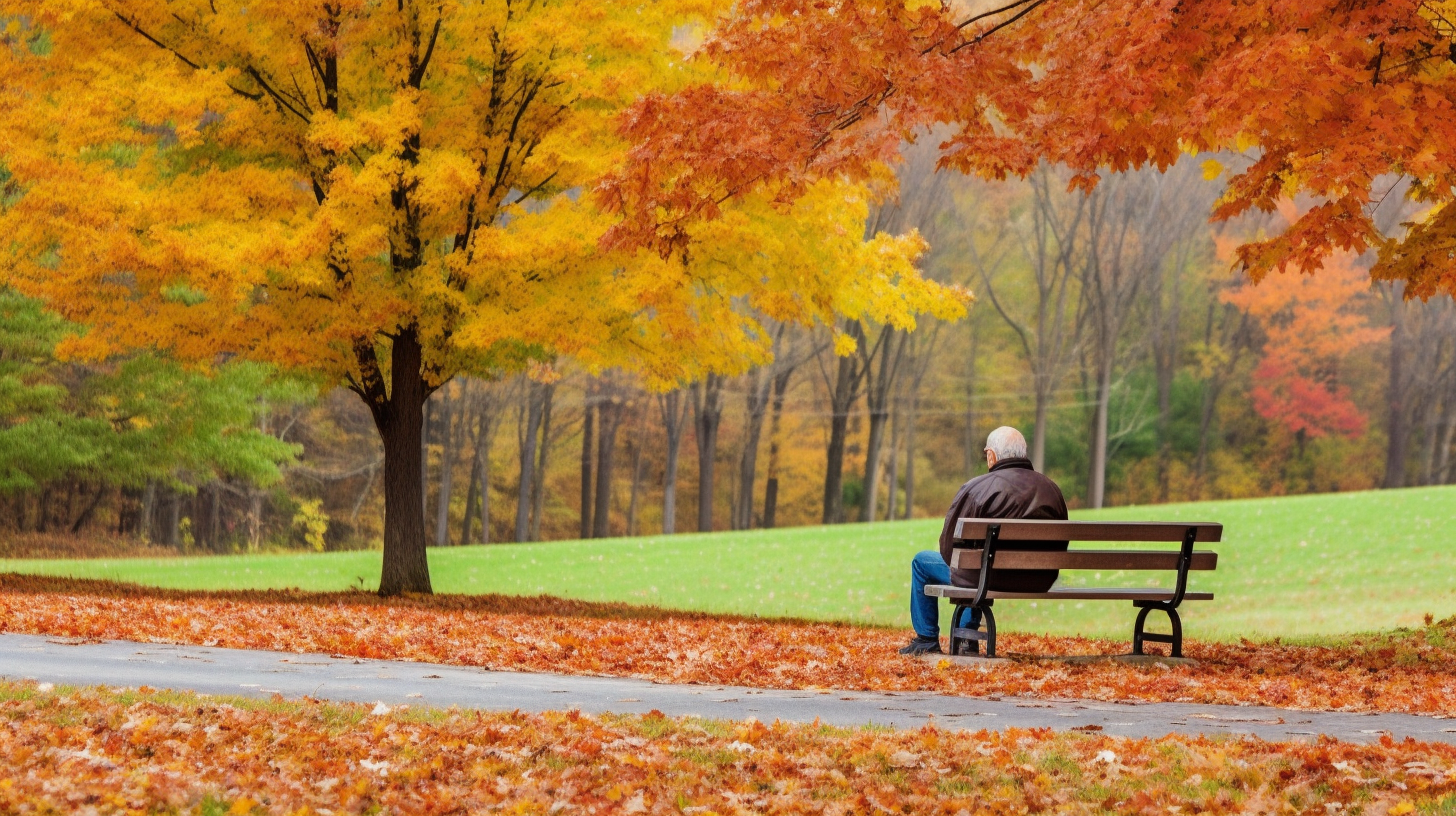 Mood: The overall mood of the image is serene and nostalgic. The man's expression is reflective, hinting at a lifetime of experiences. The autumn colors add a touch of melancholy, symbolizing the passage of time and the beauty of nature's cycles.