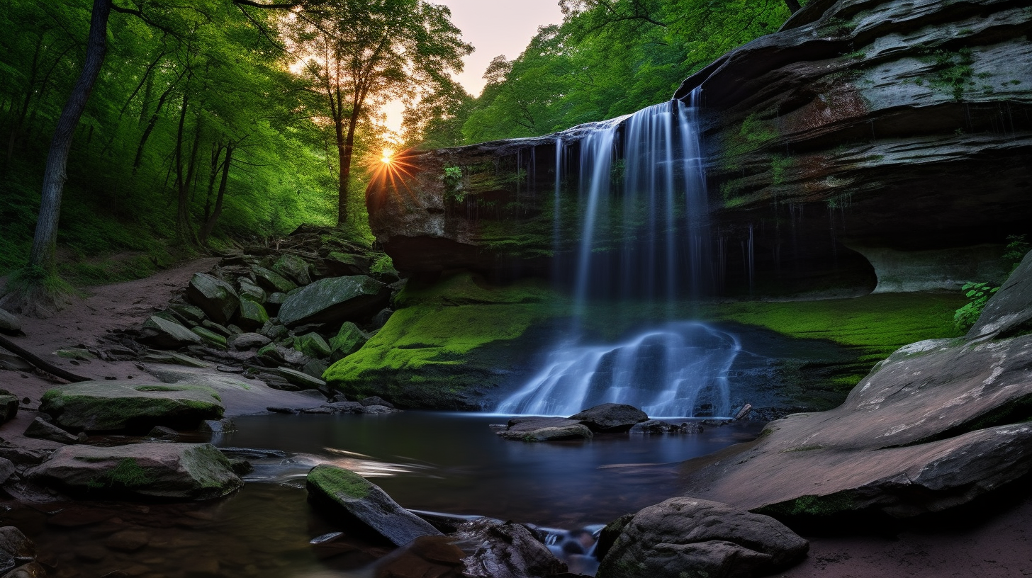 Subject: A Majestic Waterfall at Twilight Background: Lush greenery, moss-covered rocks, and a serene forest setting Mood: Tranquil, awe-inspiring, and ethereal