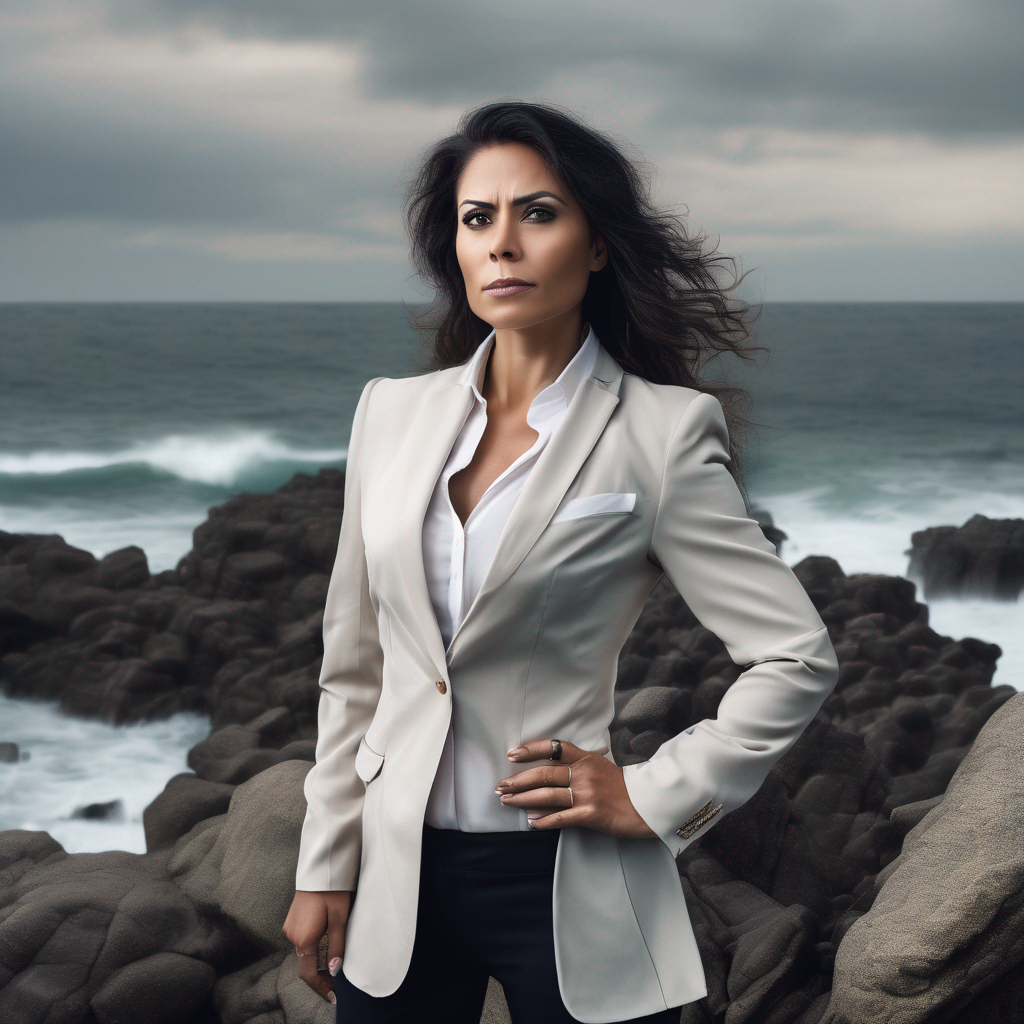 The photo captures a beautiful and sultry businesswoman standing on a rocky coast. The high angle shot accentuates her confident and determined demeanor. This award-winning photo symbolizes the fusion of strength and elegance in the world of business.